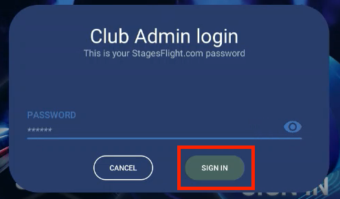 - Enter your Club Admin password and click on the SIGN IN button. If you have forgotten your Club Admin password, please visit StagesFlight.com to reset your password.